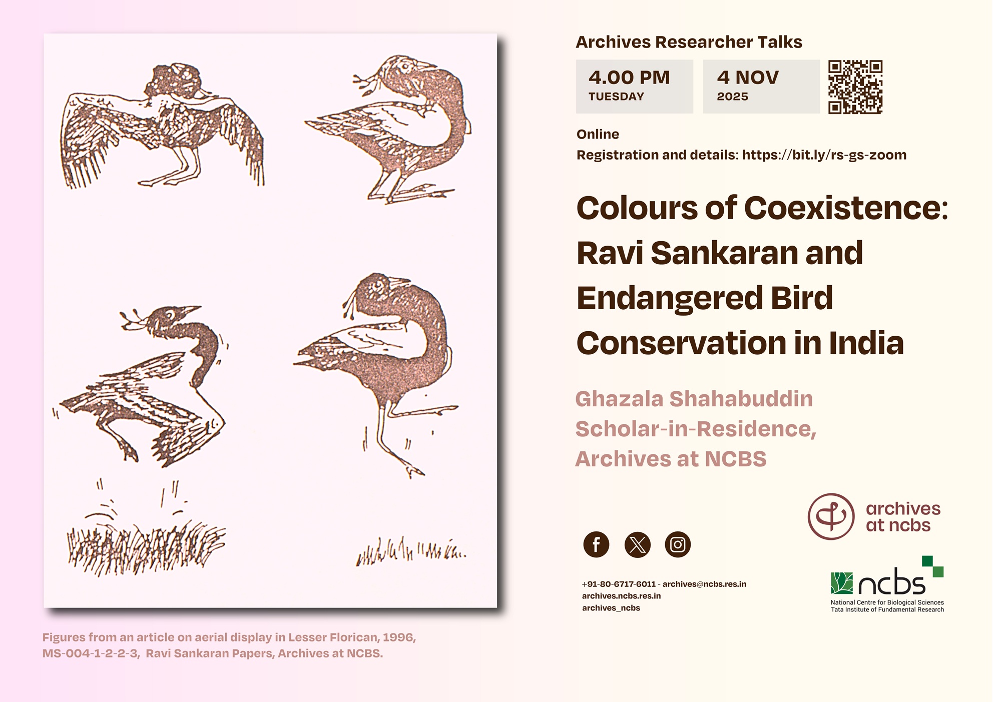 Since Independence, the preservationist doctrine has been the principal guiding framework for wildlife conservation in India, advocating unconditional protection for wild species. Yet, during the late 20th century, human-wildlife coexistence emerged as a distinct possibility; there was even a rethinking of outright bans on hunting and ecosystem use. Ravi Sankaran (1963-2009), a prominent Indian ecologist, grappled with questions of human-bird coexistence, being one of the few biologists of his time to do so. While he was possessed of a passion and a penchant for unraveling the ecology of endangered birds surviving in remote areas, he also worked towards their conservation closely with marginalized communities who shared their habitats. Based on Ravi Sankaran’s papers in the Archives at NCBS, I will explore his vision for human-bird coexistence in three strikingly different social-ecological situations: the Lesser Florican (Central India), Edible-nest Swiftlet (Andaman & Nicobar Islands) and the Blyth’s Tragopan (Nagaland Hills). How did Sankaran visualize the possibilities of human cohabitation with wild birds, in a developing country beleaguered by the inordinate demands on land? Further, how did he use ecological science to incorporate socio-economic dimensions into real-life bird conservation? Finally, I will touch on his negotiations with wildlife policy of the time while he worked around these difficult questions.