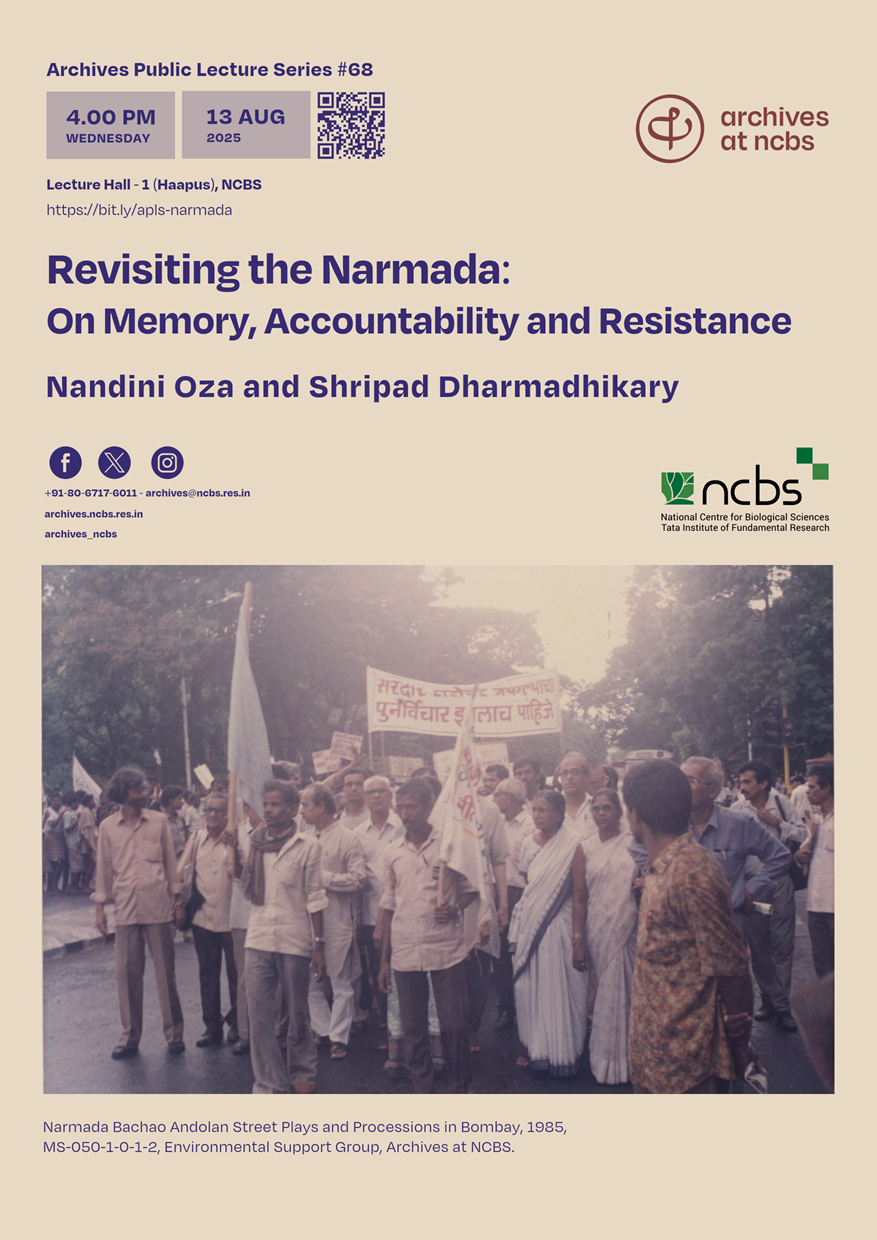 For over more than sixty years, ever since the foundation stone of the Sardar Sarovar Dam and Project (SSP) was laid in 1961, the people of the Narmada Valley affected by the SSP have been involved in many intense struggles against the project. Many of these resistance movements in the Narmada valley eventually culminated into a powerful people’s movement popularly known as the Narmada Bachao Andolan (NBA). The talk will reflect on the history of the Sardar Sarovar Narmada project and on how its archives and history are not just memories or chronicles of past events, but also include an understanding of hydrology and river systems, biodiversity and coexistence models, and social movements. The collection of papers and documents around these scientific and social issues from the movement have been deposited with the Archives at NCBS.