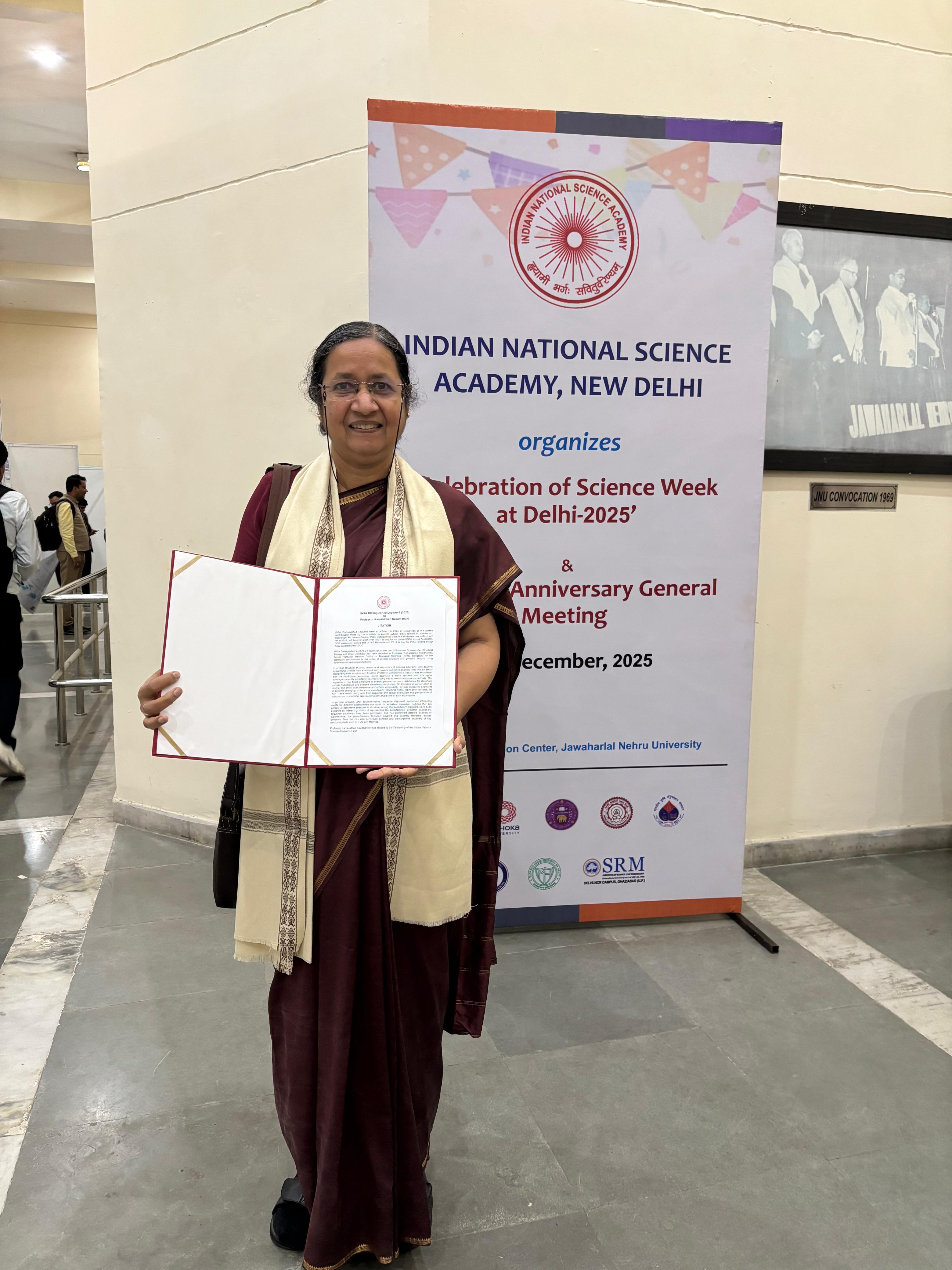Prof. R. Sowdhamini presented the prestigious INSA Distinguished Lecture at the 91st Anniversary General Meeting of the Indian National Science Academy in Delhi (Dec 2-5, 2025).